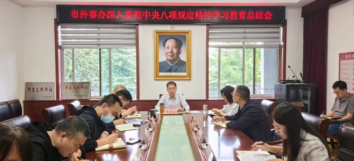 9月18日上午,市外事办党组召开深入贯彻中央八项规定精神学习教育总结会,会议传达学习了习近平总书记重要指示和中央党的建设工作领导小组会议精神,省委、市委党的建设工作领导小组会议精神,市外事办党组书记、主任李睿煜代表办党组对全办深入贯彻中央八项规定精神学习教育情况进行总结并对下一步工作提出要求。外事办副主任郭雅丽、毛俊鹤,三级调研员庞红平,市对外友好协会会长安建军参加会议。